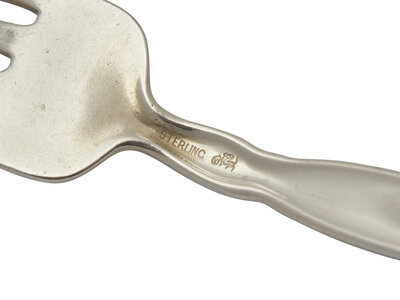 comprising twelve dinner forks, six large tablespoons, twelve small tablespoons, twelve large teaspoons, twelve small teaspoons, two demitasse spoons, and a serving fork, most engraved with monogram "A," with a few pieces lacking engraving and the serving fork engraved with monogram, "ERP," all marked. (57 items total).