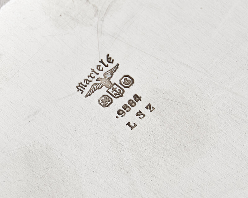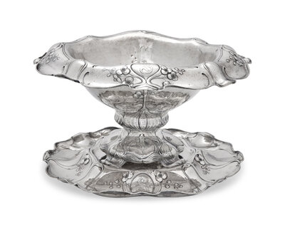 of naturalistic form, decorated with repousse flowering sprigs, both the bowl and stand bearing stylized monogram, "S," marked to underside, including silver standard mark, "9584," and numerical code, "LSZ."