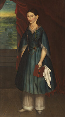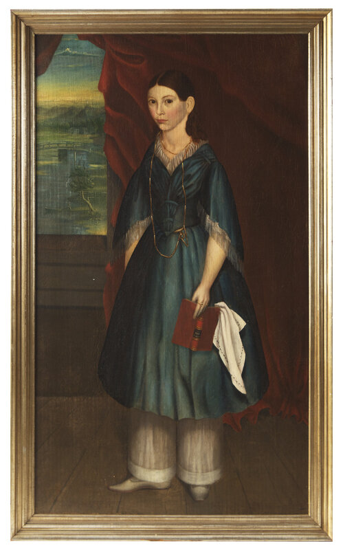 American School 19th Century, Portrait Of A Girl In Blue Dress With Book
