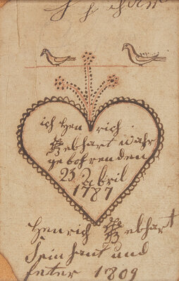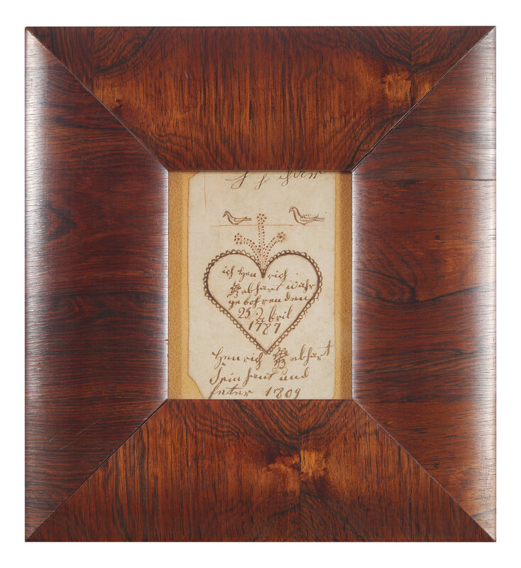 with heart issuing flowers and with birds above, ink and watercolor on paper, framed.