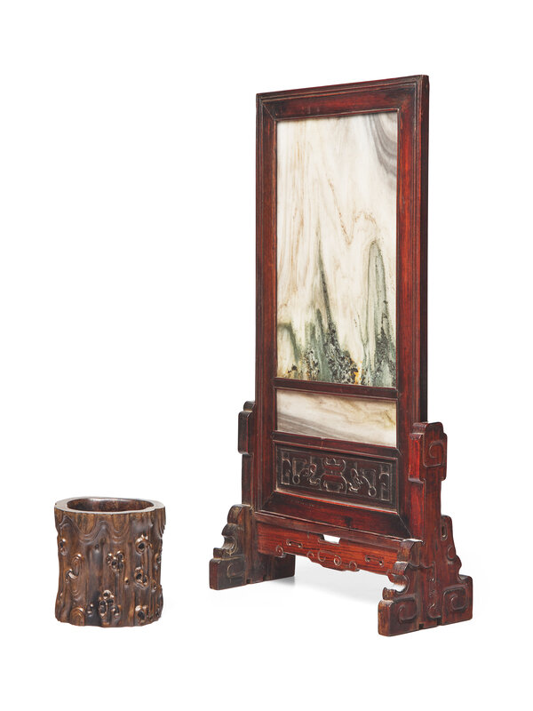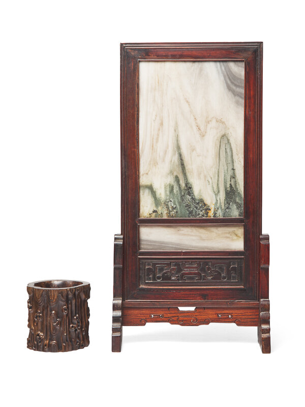 A Chinese Burlwood Brushpot, Bitong and A "Dreamstone" Inset Hardwood Table Screen