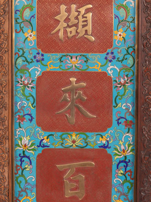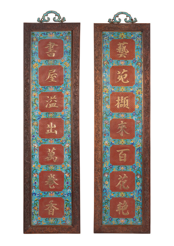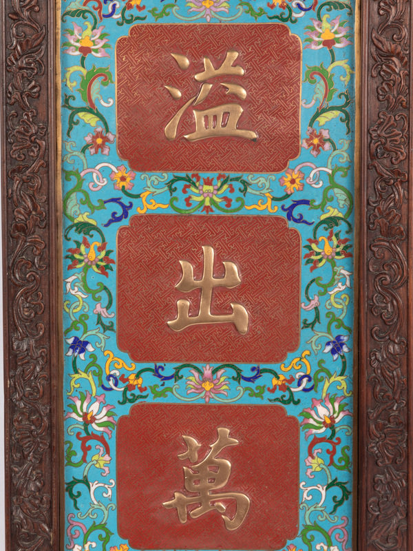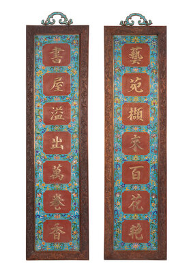 Of rectangular form, having a turquoise ground worked with multicolor scrolling lotus vines reserving squares worked gilt verse against a red ground of notched cross-hatches, set within carved hardwood frames suspended by ruyi-from turquoise enameled hangers.