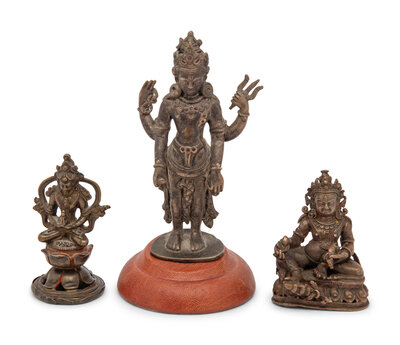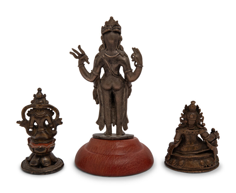 The group is comprised of a small Nepalese figure of Jambhala, an Indian or Nepalese silver figure of standing Shiva, inlaid with pink gemstones, a leather stand, and a Nepalese bronze figure of seated Amitayus on a double-fold lotus seat.