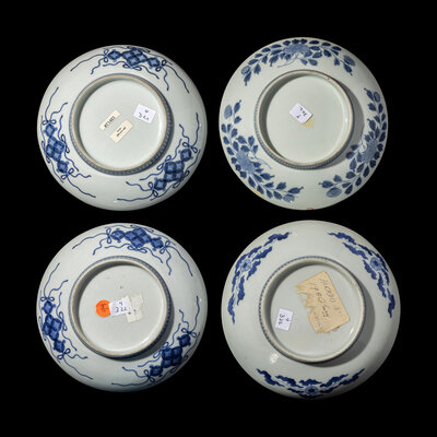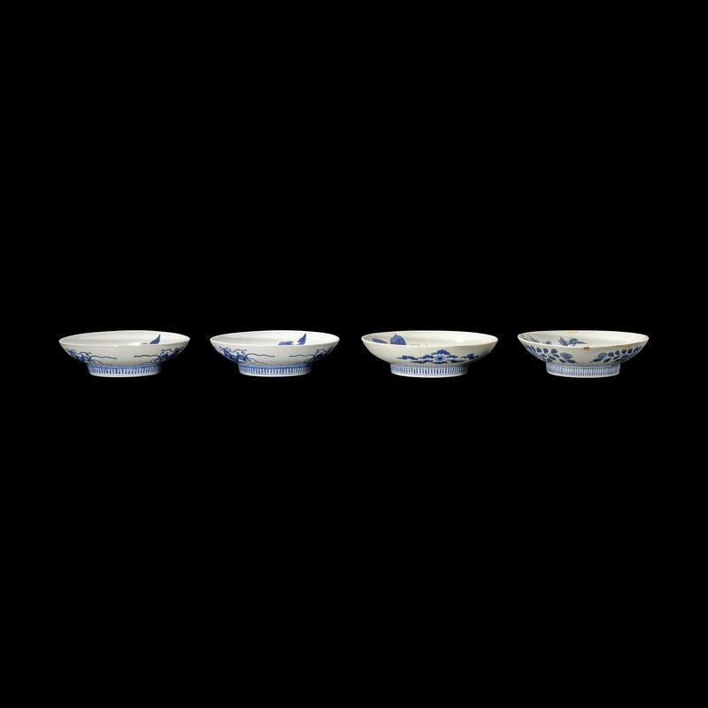 Each circular dish is on a short straight foot, decorated with 'comb' border, the center decorated in underglaze blue with delicately painted flowers.