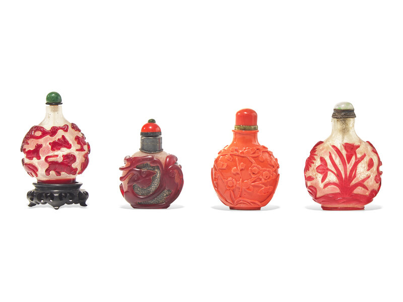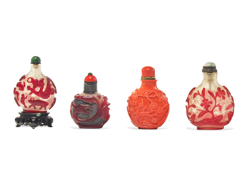 Comprising a coral red glass example, decorated with prunus branches, with cover and wood stand; a red and silver overlay glass 'chilong' example; a red overlay snowflake ground 'zodiac' example and a red overlay snowflake ground 'floral' example.
