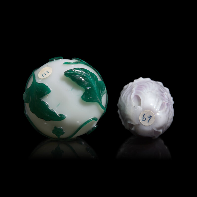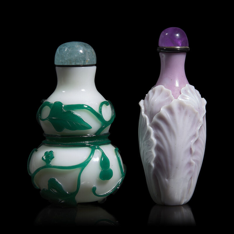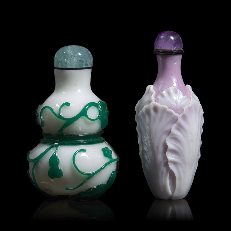 Comprising a green overlay white glass double gourd snuff bottle, circa 1780-1850, and a violet and white glass cabbage form snuff bottle, both with hard stone stopper buttons.