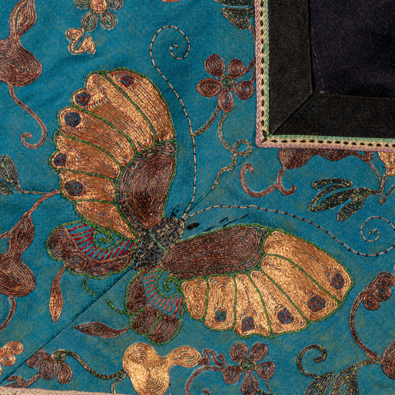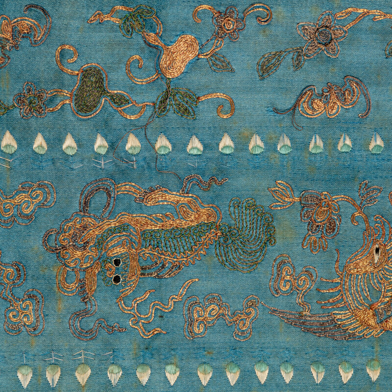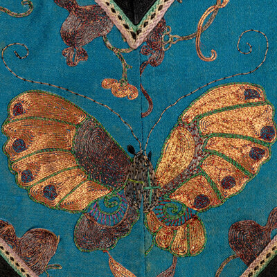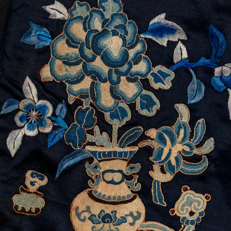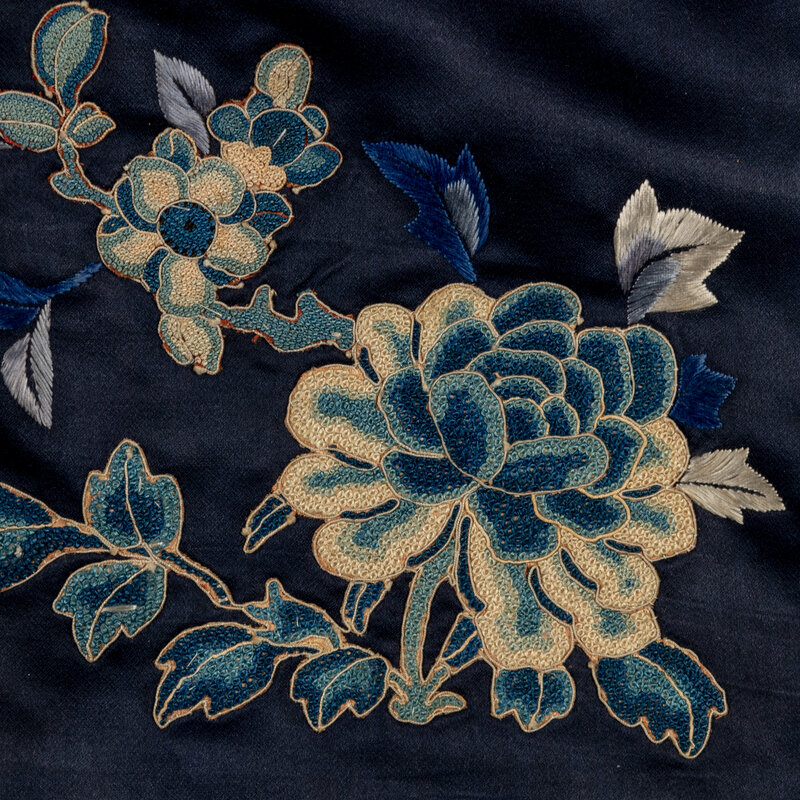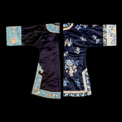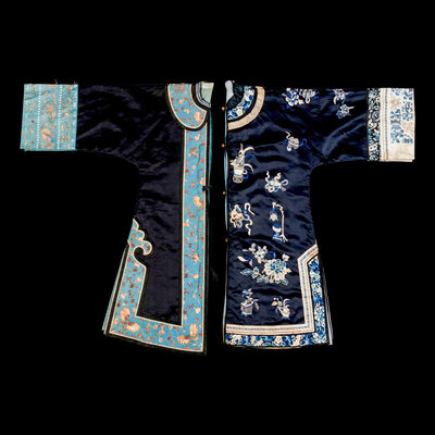 Two Chinese Midnight-Blue Ground Embroidered Silk Lady's Robes, 19th Century