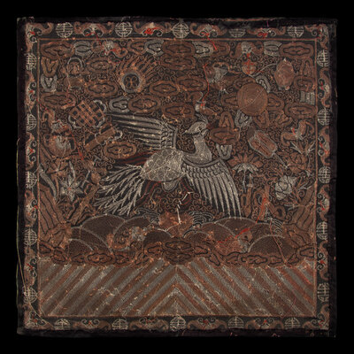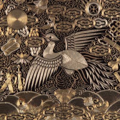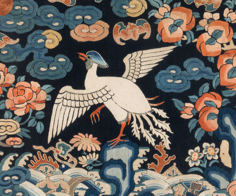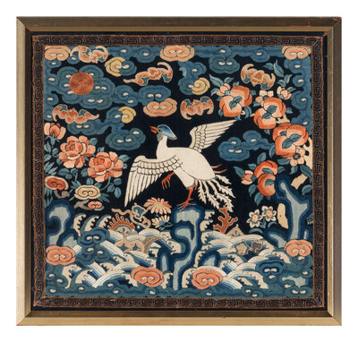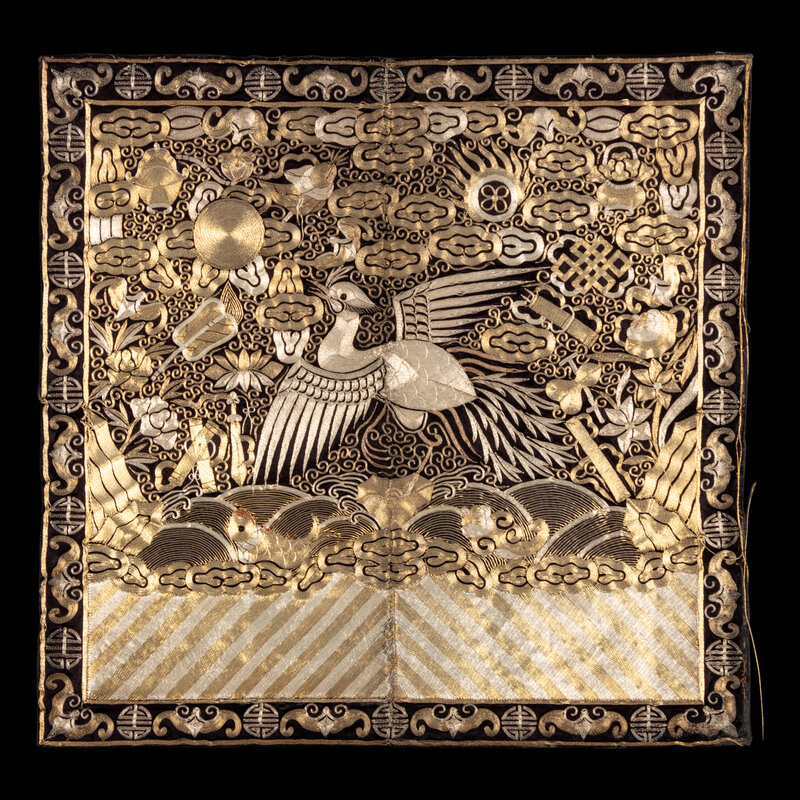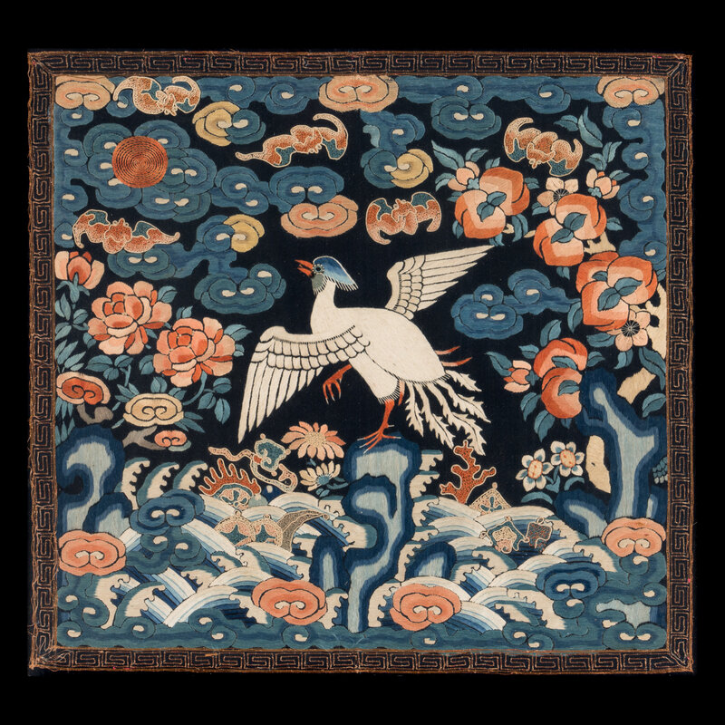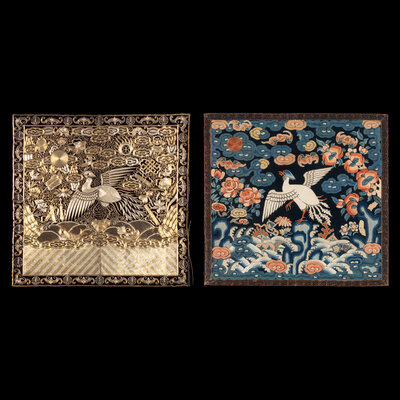 The first a example from Daoguang period (1821-1850), worked in satin stitch, the second an example from Guangxu period (1875-1908), worked in gold and silver threads. Both representing the fifth civil rank, depicting the bird upon a rock amongst foaming waves and the Eight Buddhist Emblems.