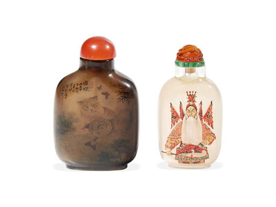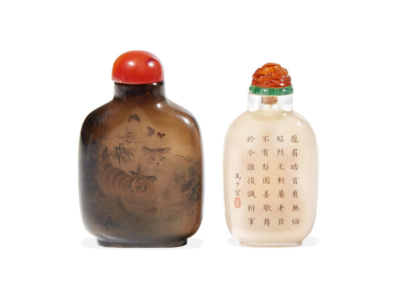 The first example in the manner of Ma Shaoxuan, of rounded rectangular form, the bottle is decorated on one side with a portrait of the celebrated Beijing opera star Tan Xinpei as Huang Zhong, wearing an elaborate dragon robe that is set on the shoulder with banners. The reverse is inscribed with a poem praising Tan's performance, followed by the artist's signature and a seal, Shaoxuan; the second depicting cats.