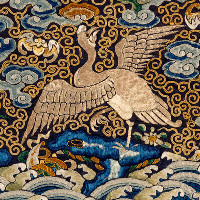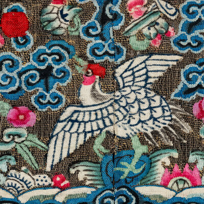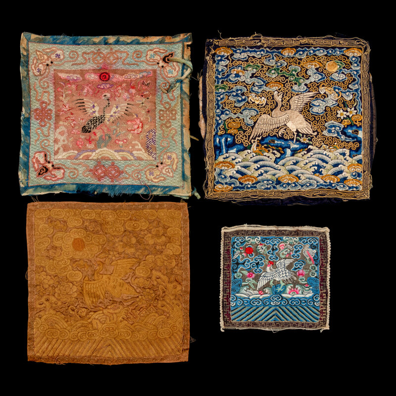 Comprising an embroidered silk 'egret' badge, a small kesi silk 'mandarin duck' badge, an embroidered silk 'wild goose' badge and a Vietnamese embroidered silk 'crane' badge.