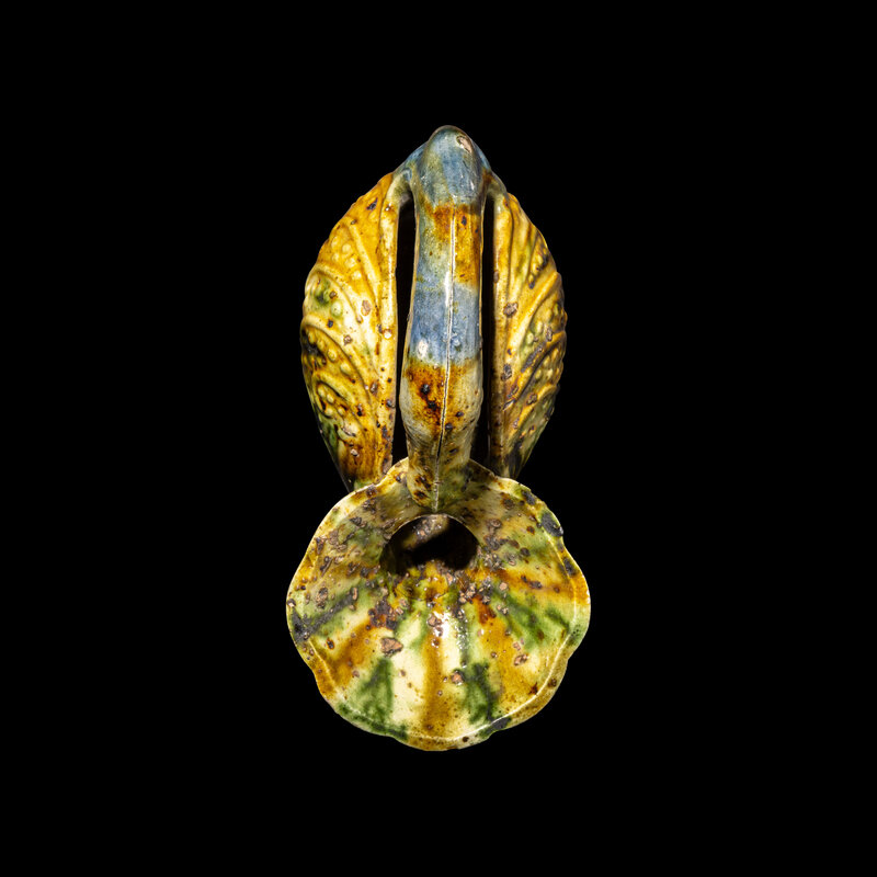 Molded as a recumbent duck with its neck arched backward over the opening between the feather-molded wings, the open beak grasps the rim of the flower-form lamp, splashed with ivory, amber, and green glazes, the base and interior left unglazed exposing the chalky white body.