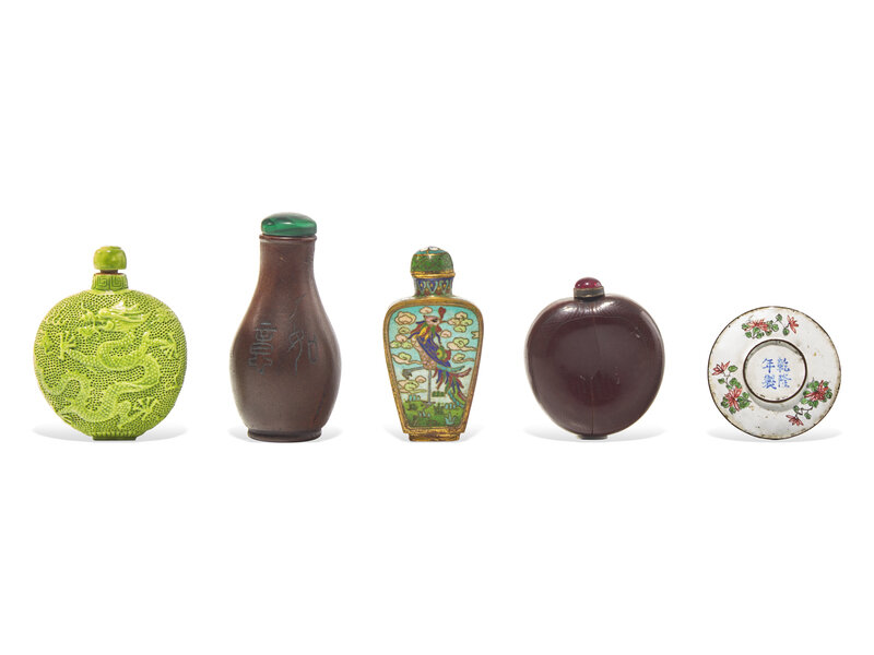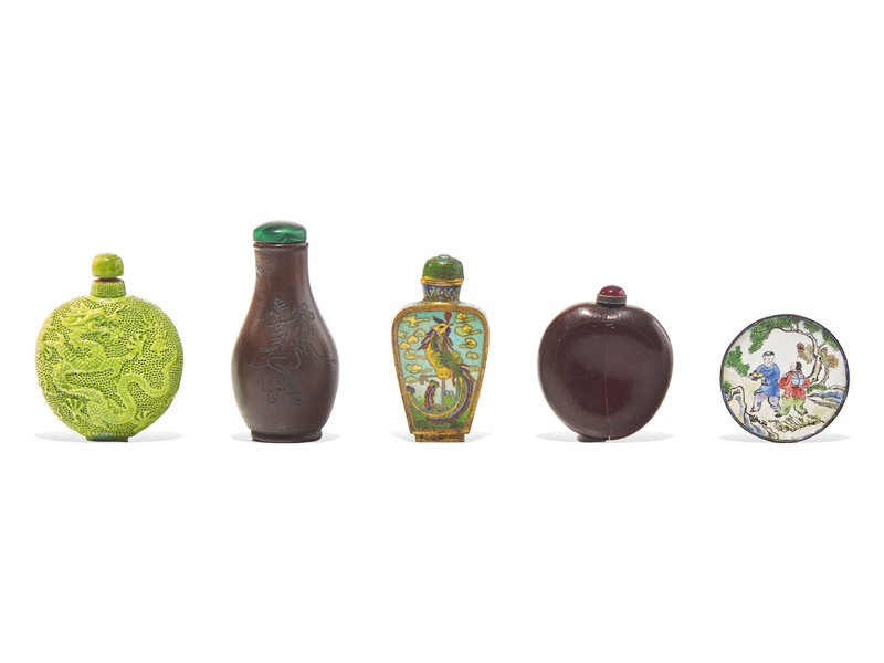 Comprising a lime green glazed porcelain molded 'dragon' bottle, molded mark to underside; an incised palm nut snuff bottle with micro calligraphy to one side, acrobats to the other; an incised organic snuff bottle with one face decorated with a dancer, the reverse with two archaistic characters; a cloisonné enamel snuff bottle decorated on both sides with phoenix; and a Canton enamel circular snuff dish with the front painted with two boys underneath pine trees, the reverse bearing a Qianlong four-character blue enameled mark.