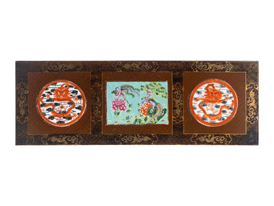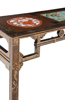 the rectangular top divided into three sections, each inset with a porcelain panel against a diaper ground, two panels painted with iron red enameled sinuous dragons amongst clouds, and one panel showing phoenix birds amongst flowering peonies; all bordered with striding dragons flanked by ruyi heads, set above background with interlocking T's; the openwork aprons decorated on each side with twisted robes suspending a bi disc, gilt highlighted dragon decoration continued on the rectangular section legs joined by stretchers at the sides, ending in hoof feet.