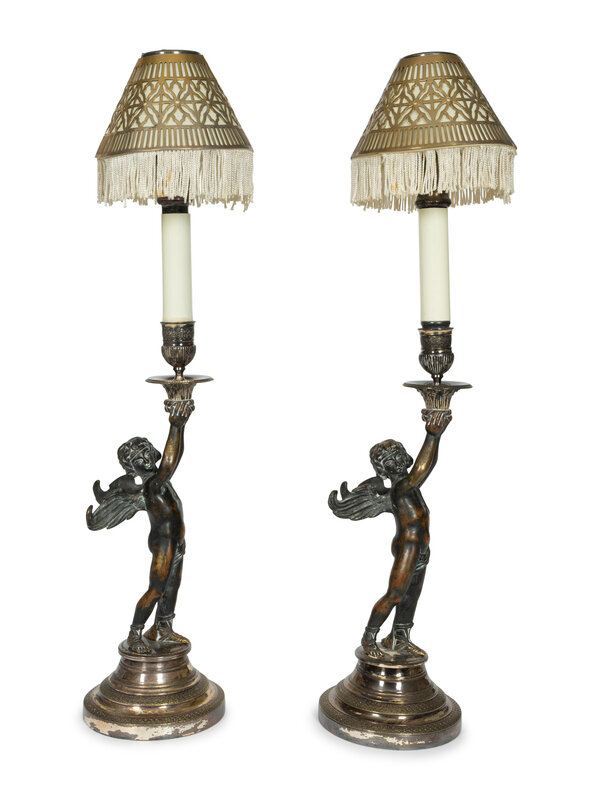 Each modeled as a winged figure, now mounted as lamps with pierced silver shades