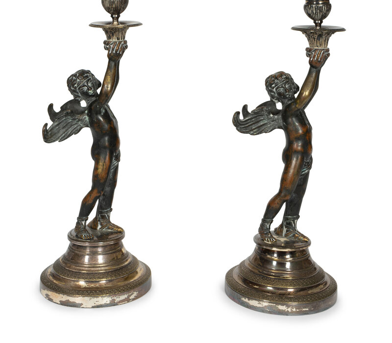 A Pair of Continental Patinated Bronze and Silver-Plate Candlesticks