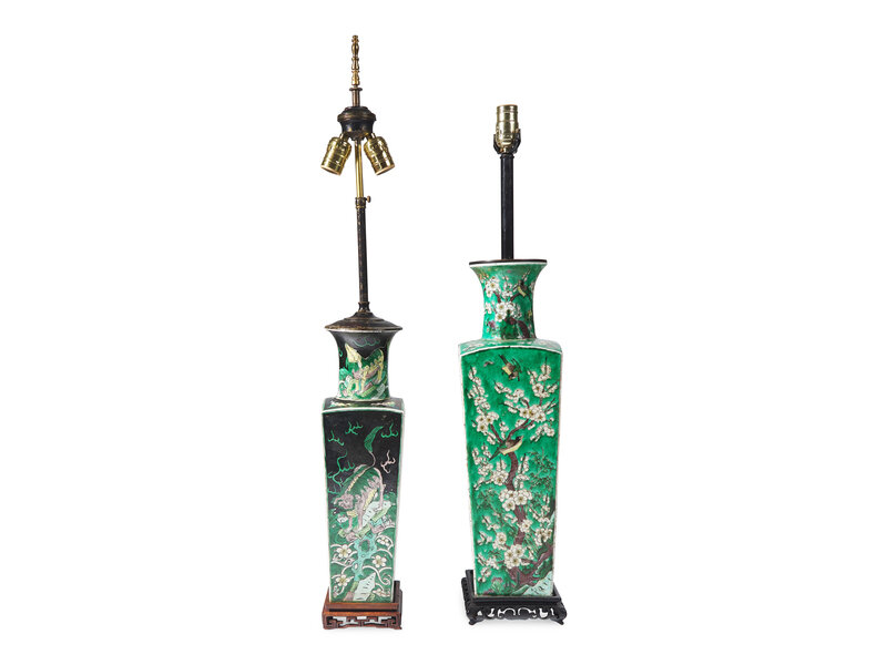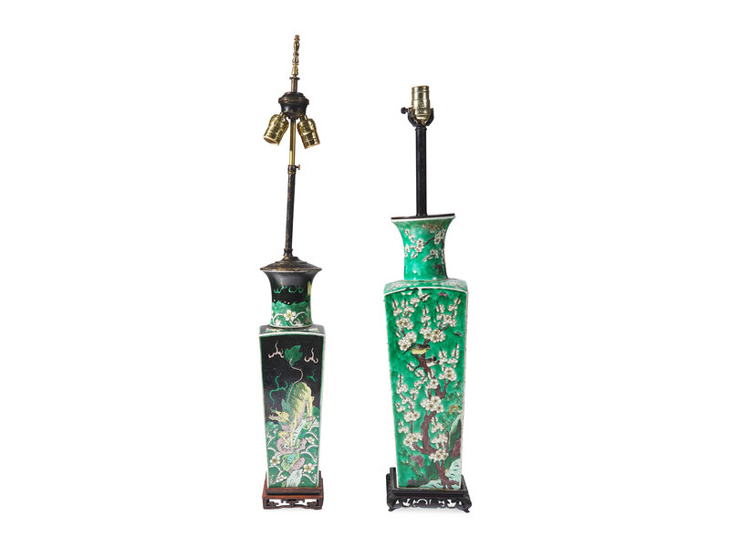 Two Chinese Famille Verte Porcelain Faceted Vases Mounted As Lamps