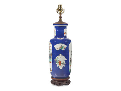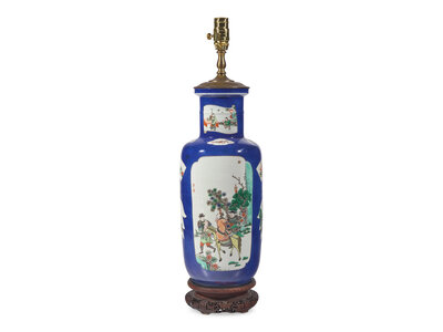 A Chinese Famille Verte Porcelain Roleau Vase Mounted As A Lamp