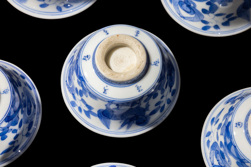 Each is delicately potted with deep sides, rising from the small ring foot to the slightly flared rim, decorated on the exterior with a qilin and flowers.