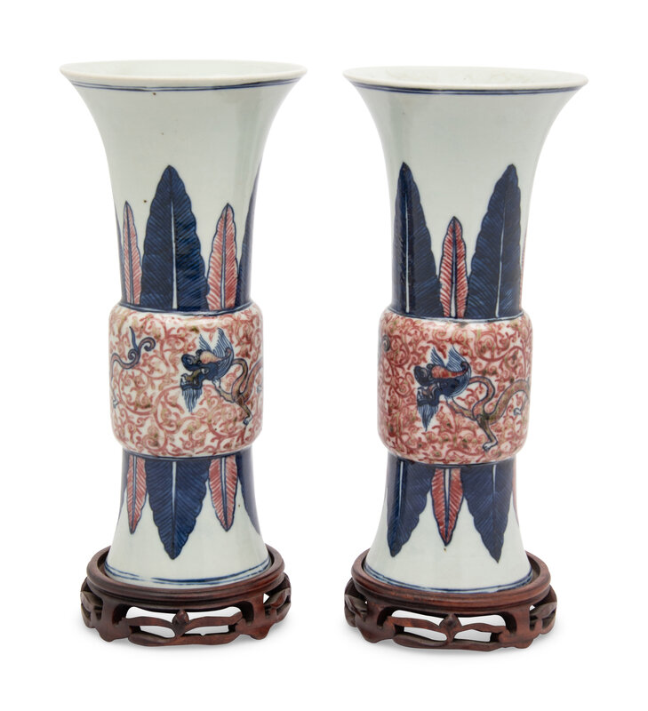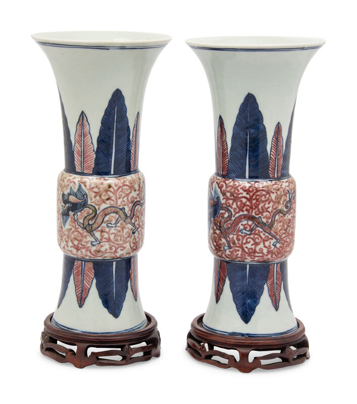 A Pair of Chinese Copper Red and Underglaze Blue Gu Vases