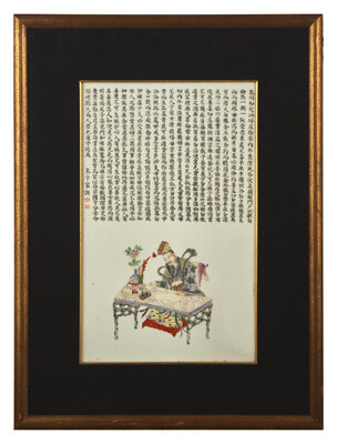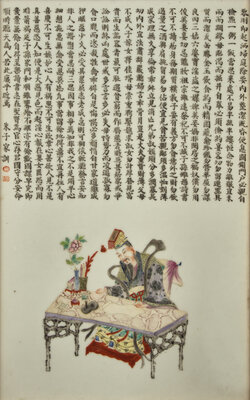 Depicting a scholar seated by the writing desk, underneath inscriptions from Zhuzi jiaxun in black characters. Framed