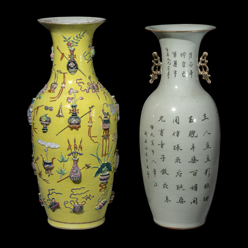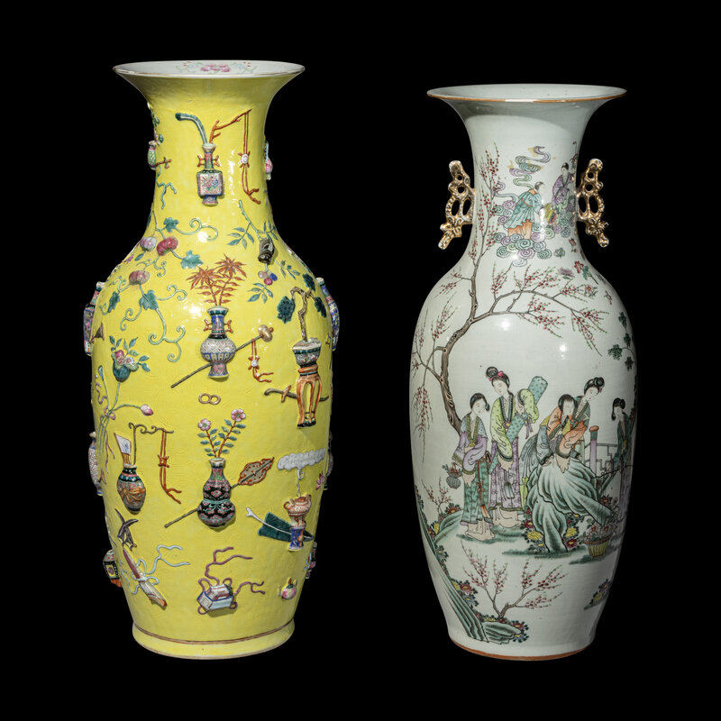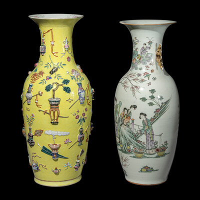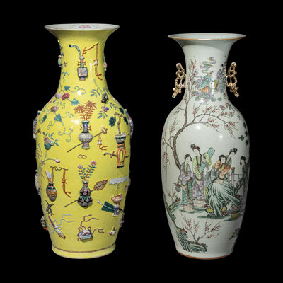 each of baluster form with an ovoid body rising to a narrow neck and flaring mouth rim, the first is painted and molded with various scholarly implements against a yellow ground, the second is painted with ladies opposite verse, each face divided with molded gilt decorated handles.