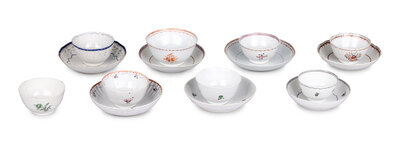 comprising six cups and saucers, and one set comprised of a pair of cups with one matching saucer, painted with floral decoration.