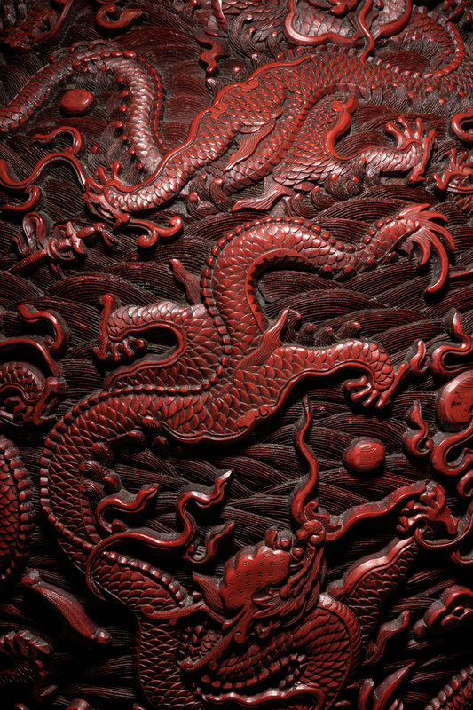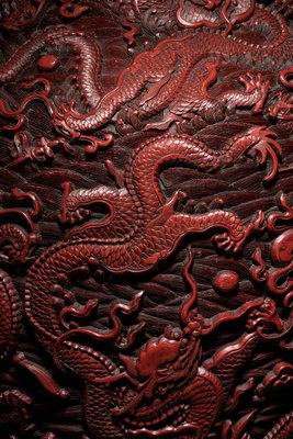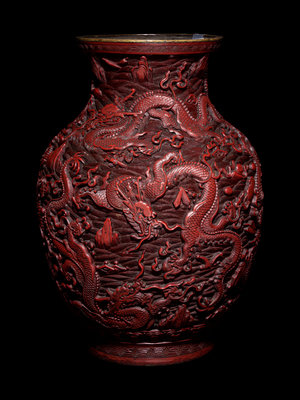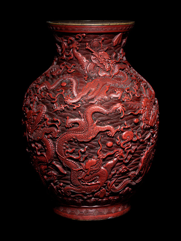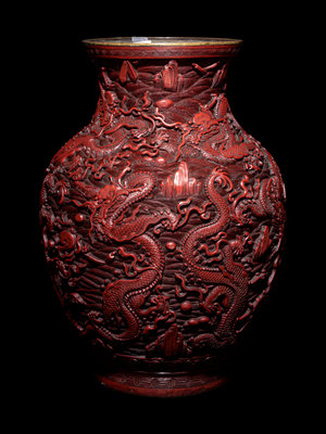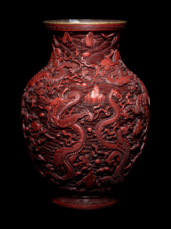 the metal core of baluster form, rising from a straight foot over a recessed base, with a globular body narrowing to a short neck with a slightly flaring mouth rim, covered in dense layers of red lacquer, carved deeply in relief to show nine dragons twisting in pursuit of flaming pearls against a ground of tumultuous waves, the mouth and foot bordered in keyfret bands, the foot with a further band of lotus petals beneath craggy peaks.
