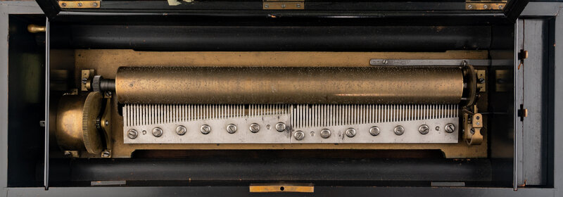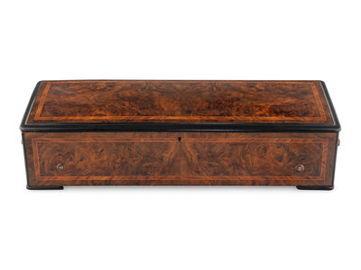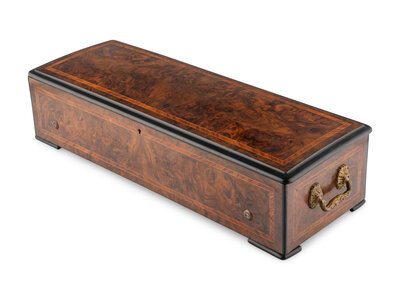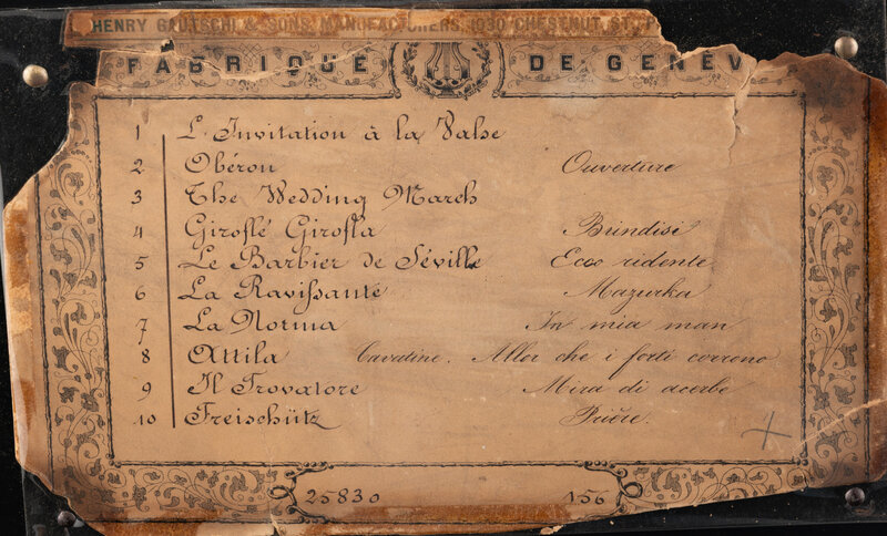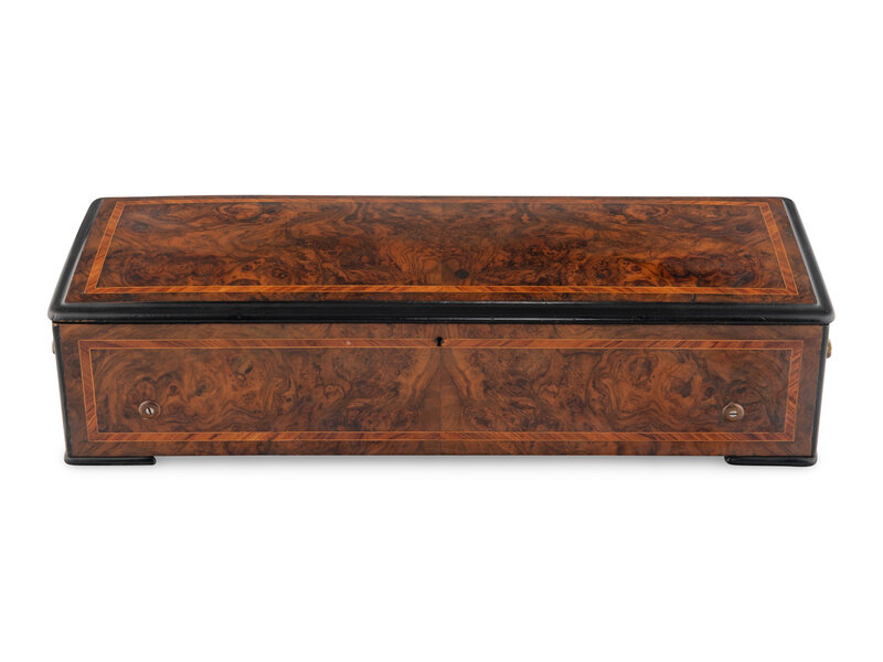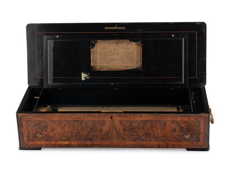 serial no. 25830, with a 19-inch cylinder, double comb movement, and tune card with Henry Gautschi Philadelphia retailer's label, in a burl walnut case with carrying handles.