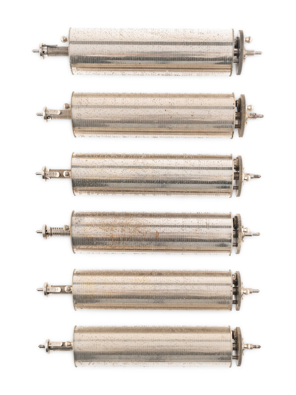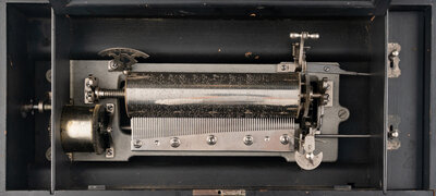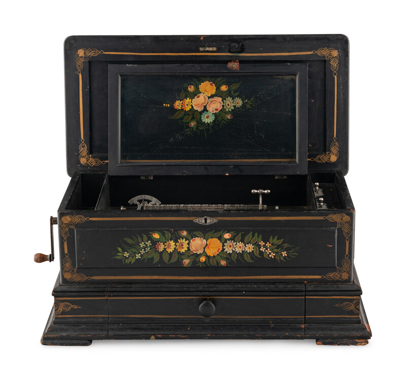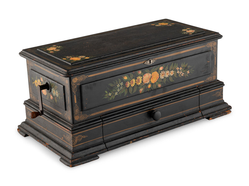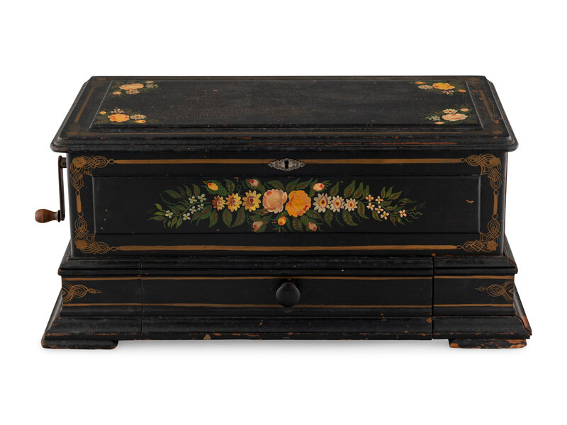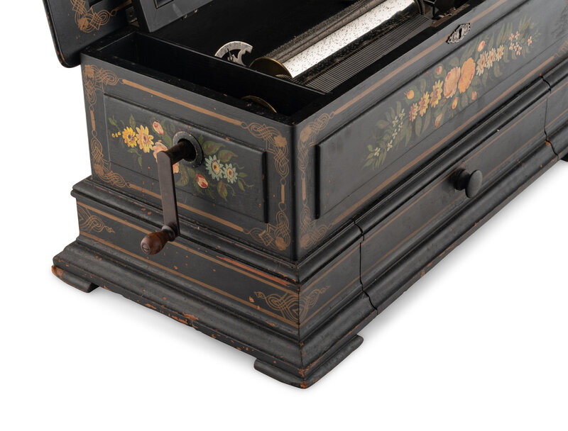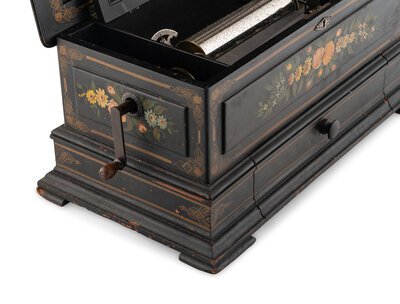 serial no. 90441, with nine 9-inch cylinders playing six airs each, speed regulator, tune selector and tune indicator, in a black and floral-painted case, the drawer with storage for three cylinders, and seven cylinders in original transit cases.