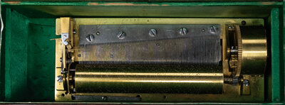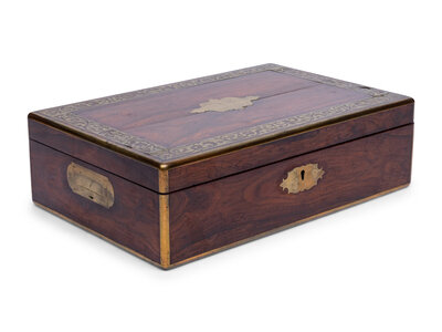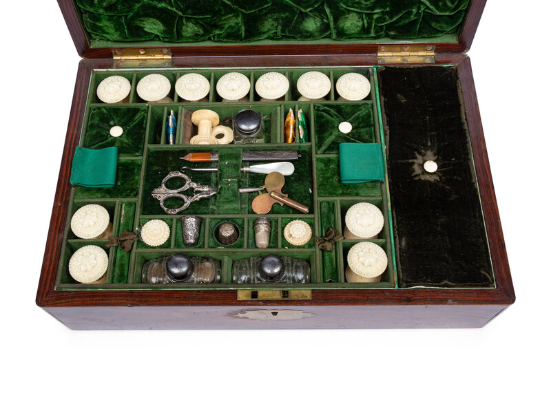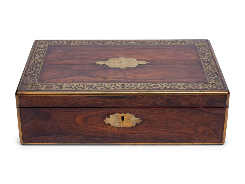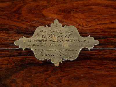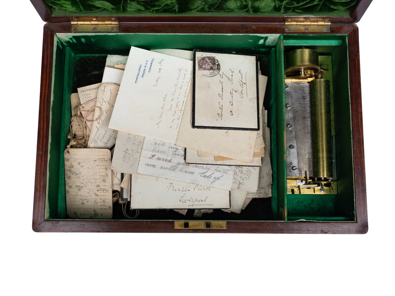 with 5 inch cylinder, playing three Mozart arias, in brass banded kingwood case with fretted brass border, having a plaque on lid inscribed 'This Box is Presented to Mrs. Jones as a Tribute of Gratitude & Esteem by those who have experienced her constant & affectionate Kindness,' with flush handles and fitted, velvet lined interior containing ornamentally-turned perfume bottles, thimbles, and other items, together with a collection of late nineteenth century letters and dance cards.