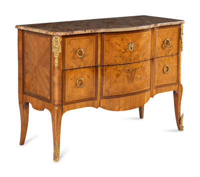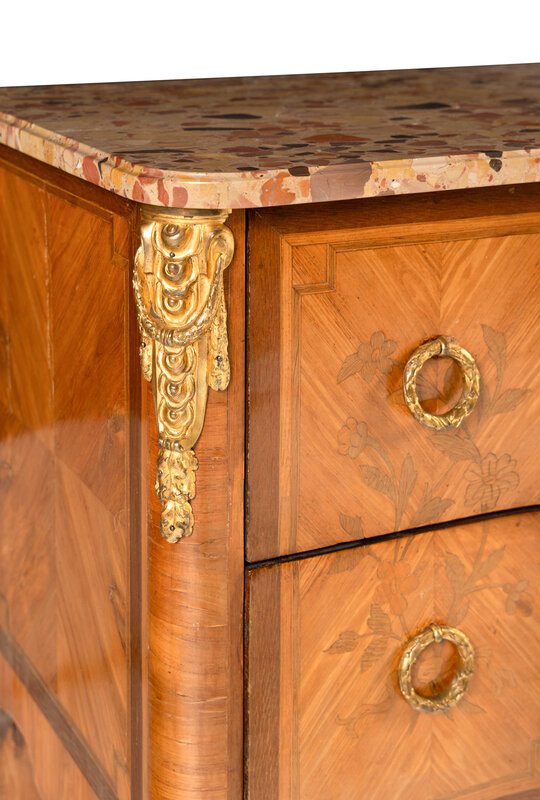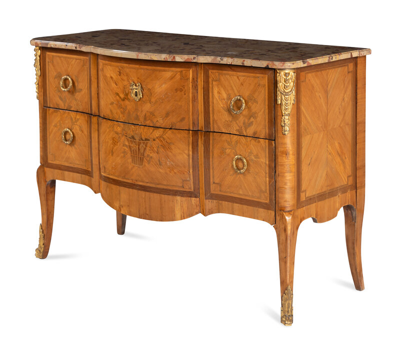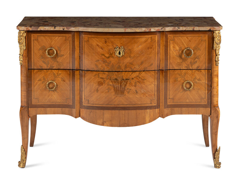 A Louis XV/XVI Transitional Style Marquetry Marble-Top Commode