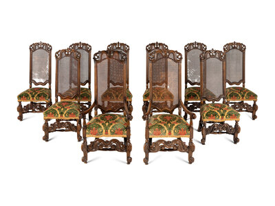 A Set of Ten William and Mary Style Caned and Carved Beechwood Dining Chairs