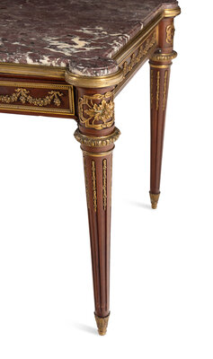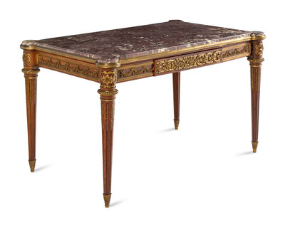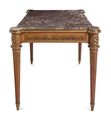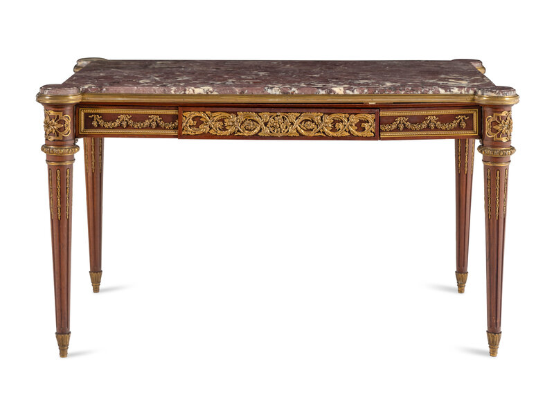 A Louis XVI Style Gilt Bronze Mounted Mahogany Marble-Top Center Table