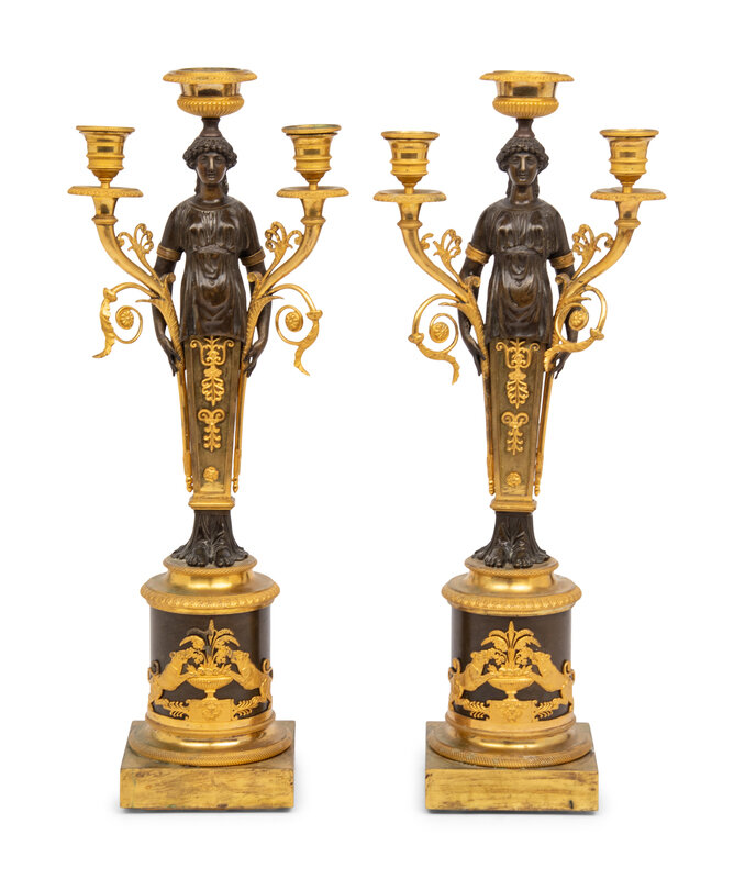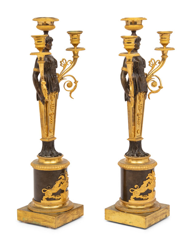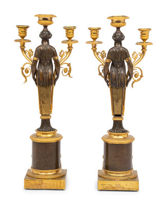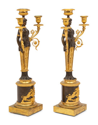 A Pair of Restauration Ormolu and Patinated Bronze Figural Three-Light Candelabra