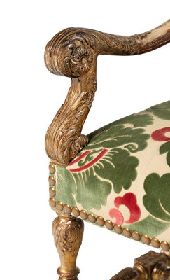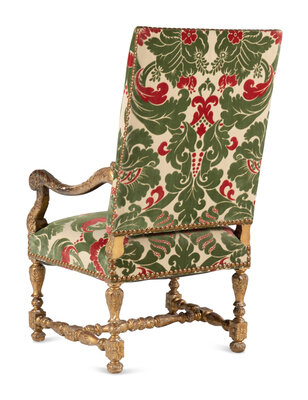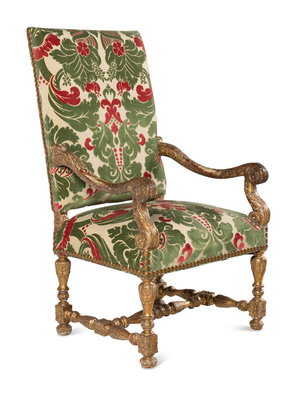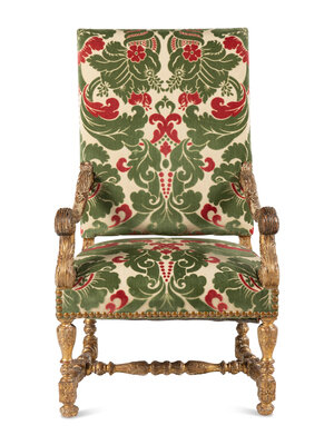 upholstered in a green, crimson and cream cut-and-voided silk velvet.