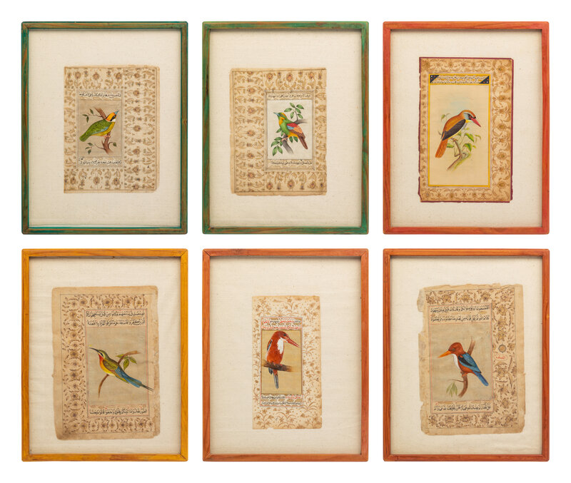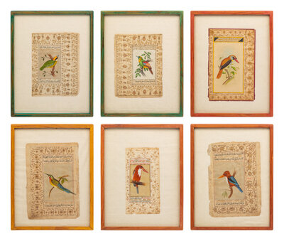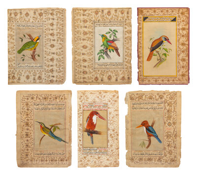A Group of Six Persian Illuminated Manuscript Pages with Bird Illustrations