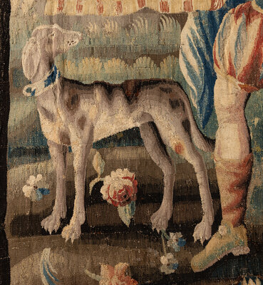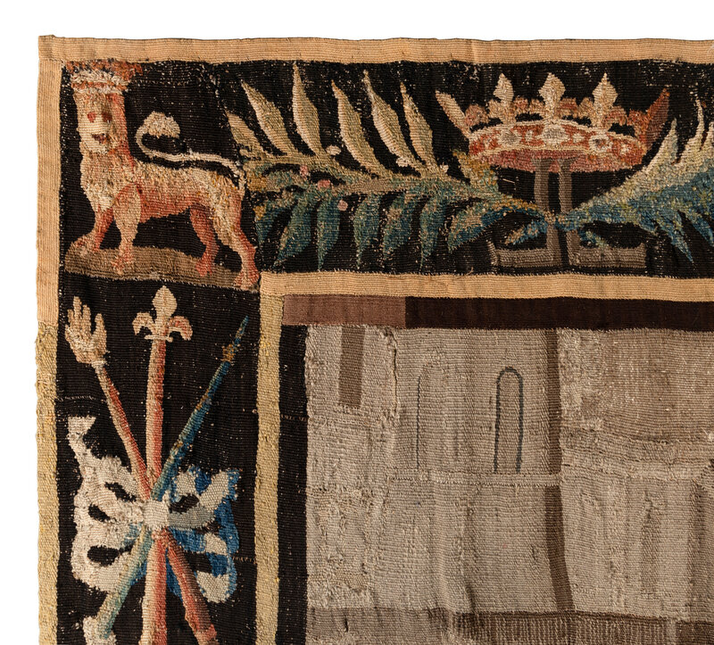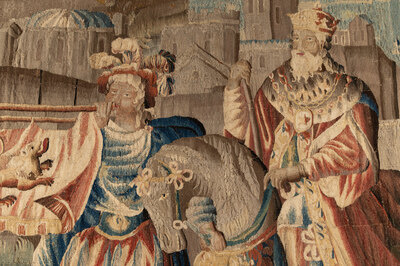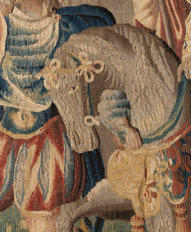 depicting King Henry II of France on horseback with an attendant blowing a trumpet at his side, a village in the background.