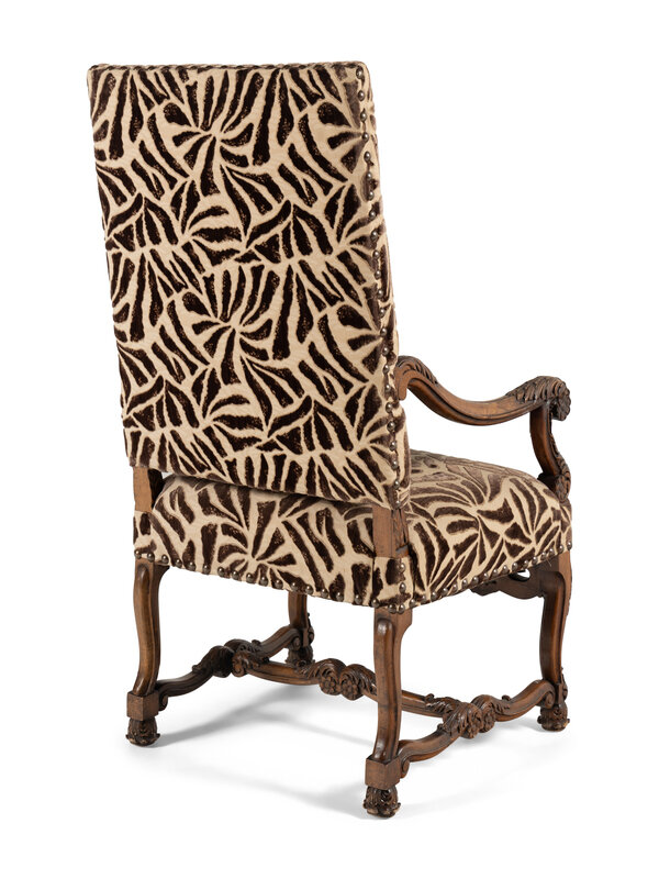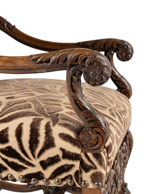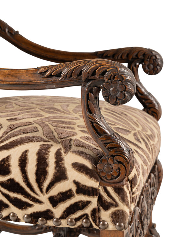 upholstered in a sepia toned cut-and-voided velvet.