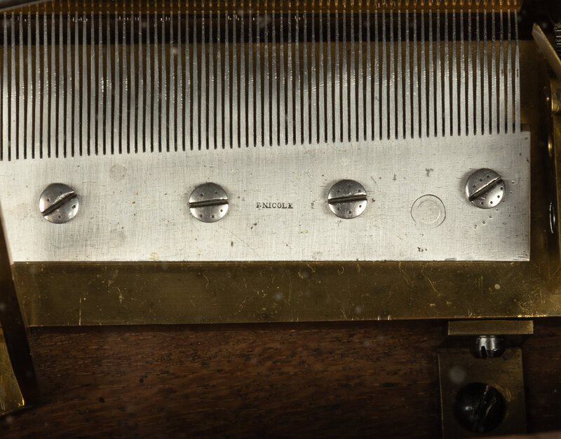 with 7 x 2 inch cylinder, playing 8 airs on four revolutions, the cylinder with grid pattern markings the two-piece comb stamped 'F. Nicole' twice with two extra bass teeth screwed sideways into the main section, in an ebonized wood case with ormolu fittings on bun feet, with later glass top.