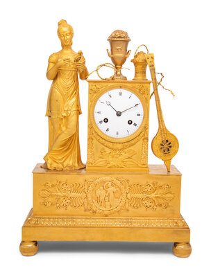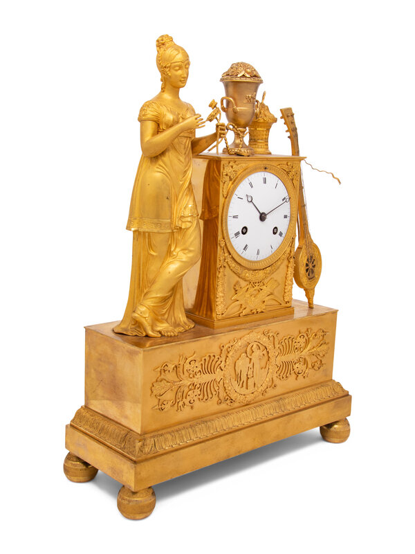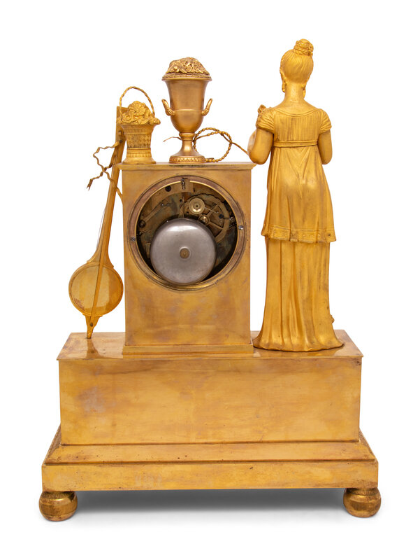 the clock cast as a lady holding a flower next to an urn and instrument, the fusee-drive movement with 12 1/2-inch cylinder playing eight airs, the sectional comb with teeth in groups of one and three.