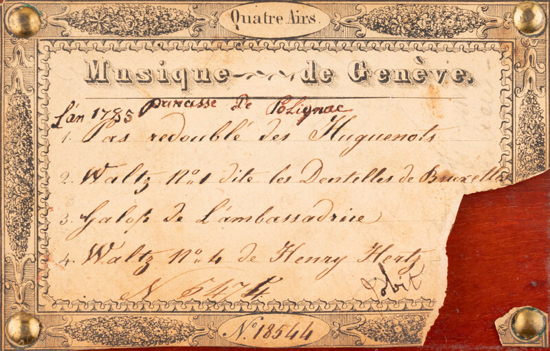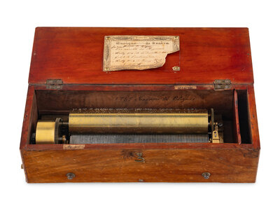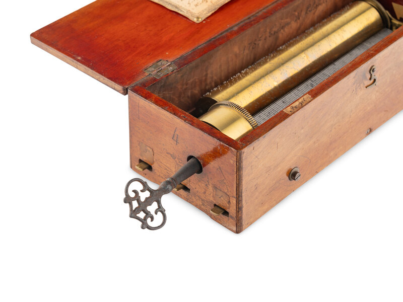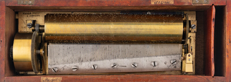 serial no. 18544. Gamme no. 5474, with 8 inch cylinder, playing 4 airs, the comb signed F. Nicole, with tune card in fruitwood case with exposed controls.