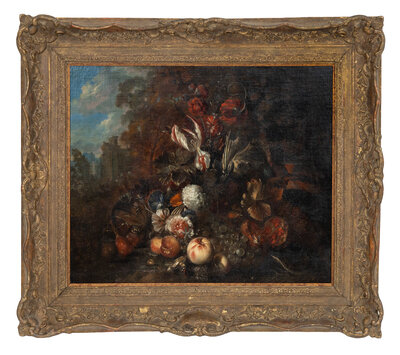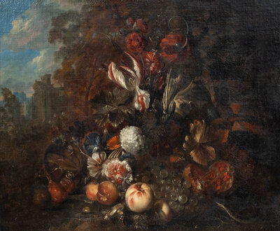 Still Life with Flowers, Fruit and Snake in a Forrest, with Ruins in a Distance