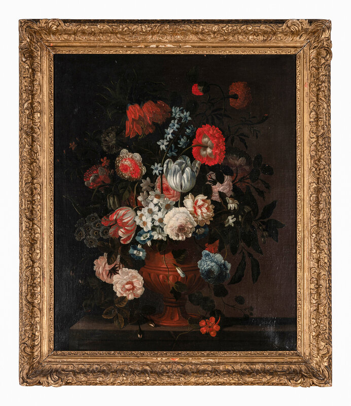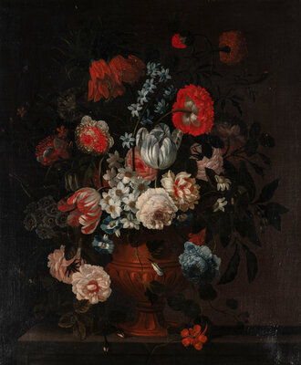 Still Life of Tulips, Narcissi, Roses, Peonies, Carnations and Other Flowers in a Vase on a Stone Ledge