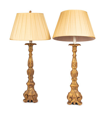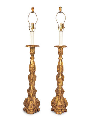 A Pair of Italian Giltwood Prickets Mounted as Lamps