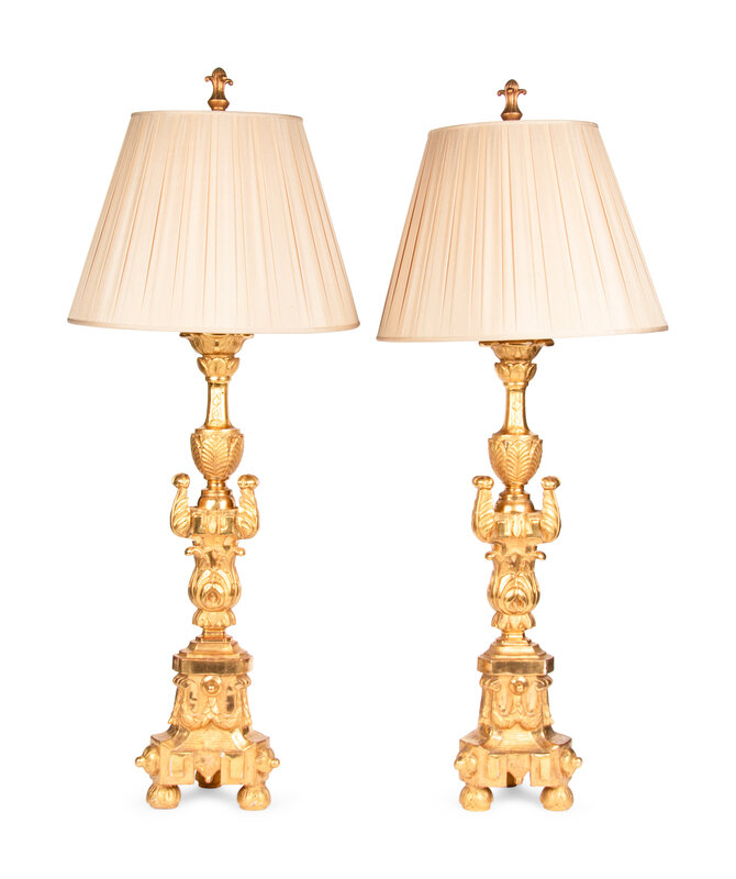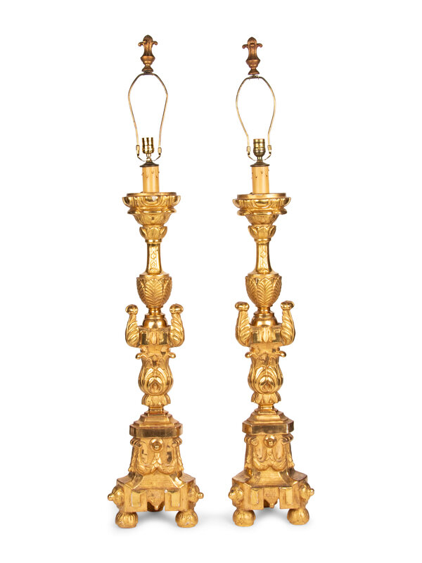 A Pair of Italian Giltwood Prickets Mounted as Lamps