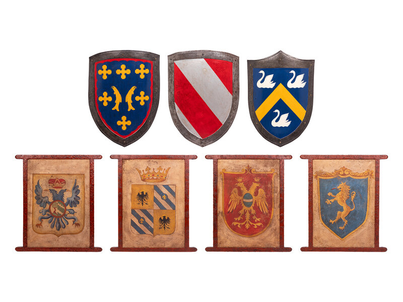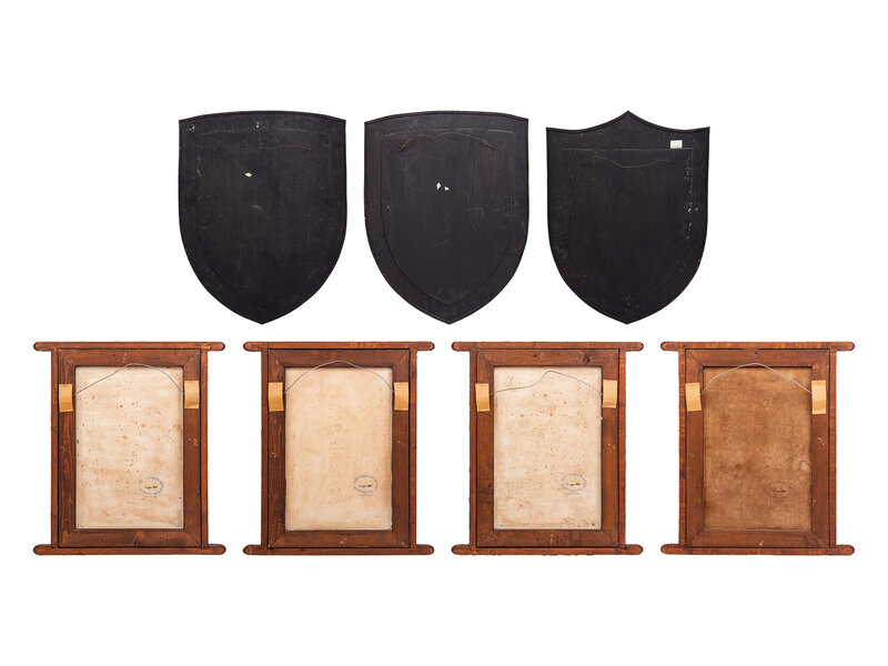 Height of shield 27 1/2 x width 20 inches; height of armorial panels 30 x width 27 1/4 inches.