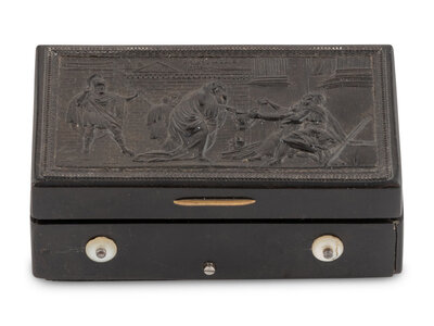 with 2 1/2 inch cylinder and sectional comb teeth in groups of four, with the lid depicting a scene from Belisaire.
