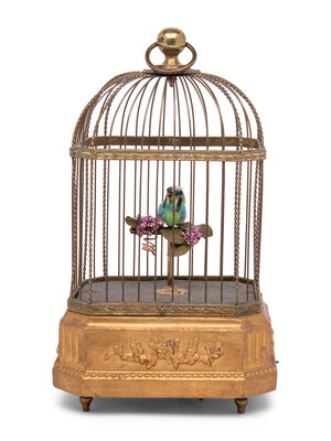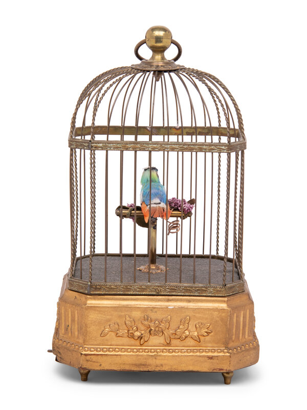 with rectangular gesso wood base with canted corners and brass cage; the bird with moving head, beak and tail.