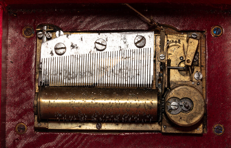 with sewing implements, two-air movement, and tune sheet marked A.D.