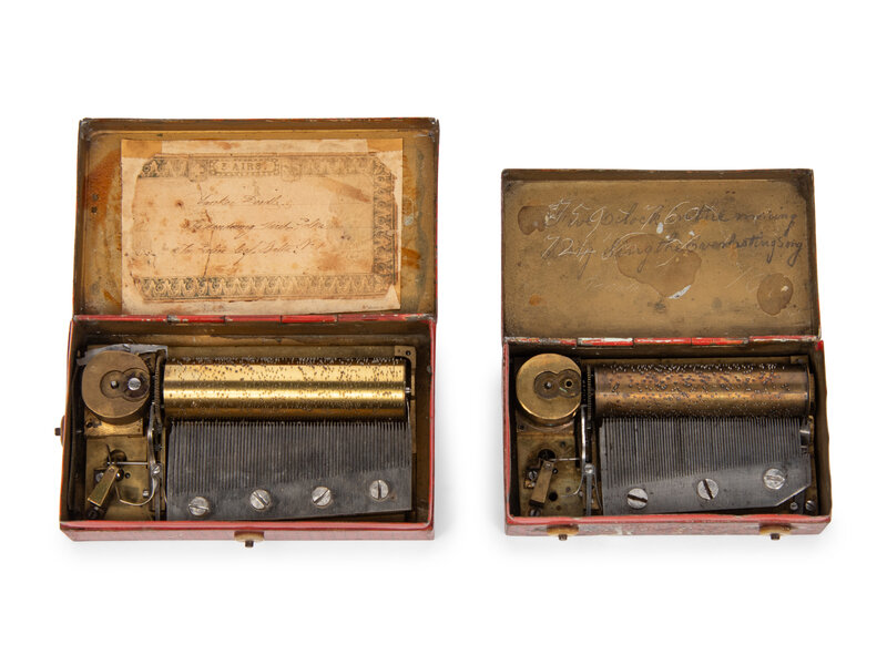 the first with a 3 inch cylinder, playing 3 airs, including Yankee Doodle; the second appears inoperative.